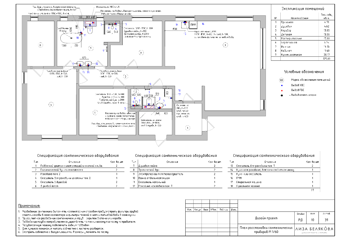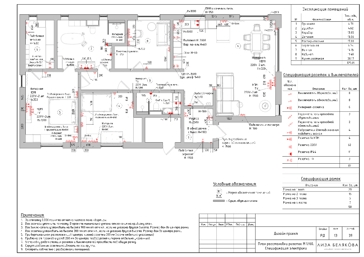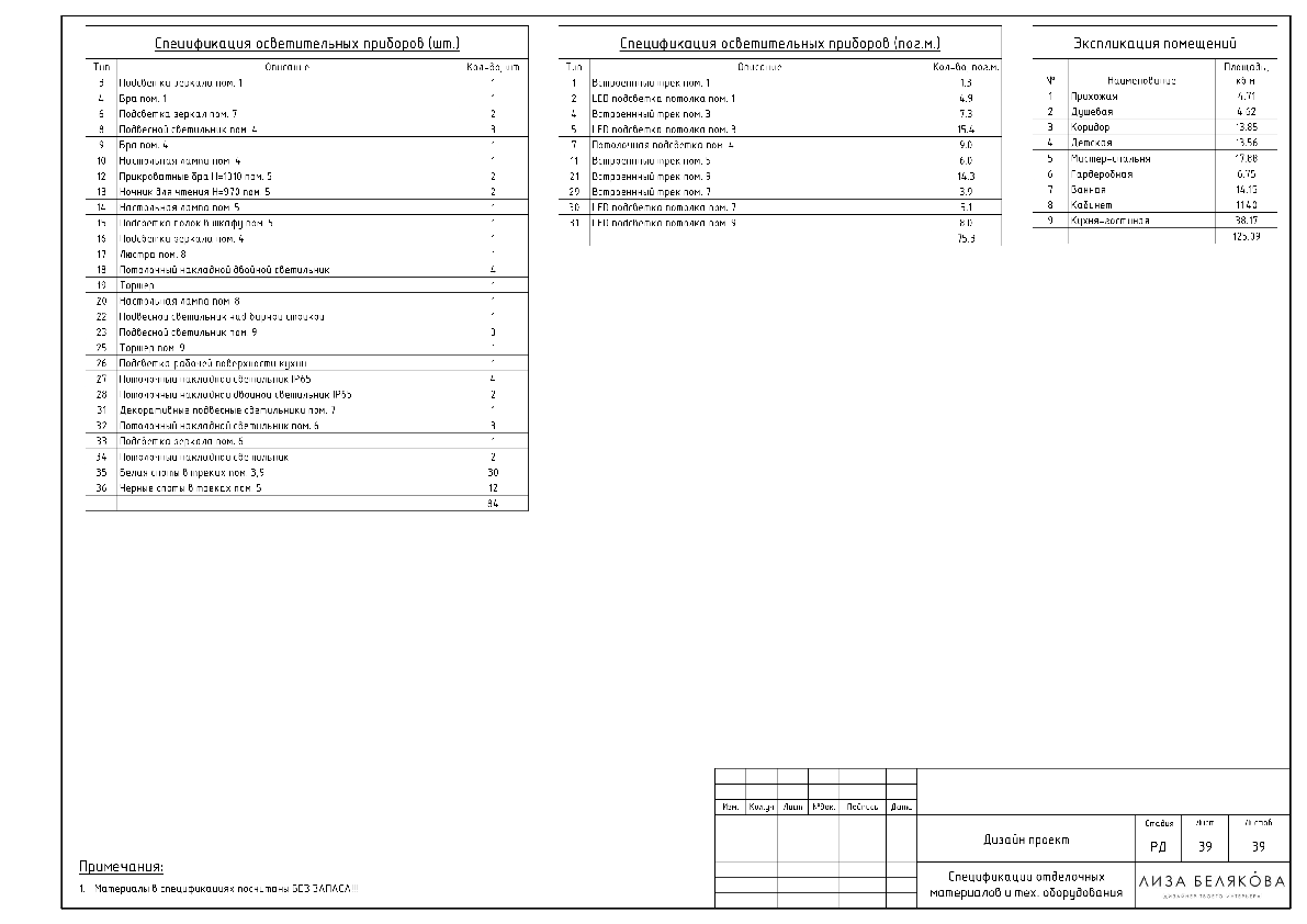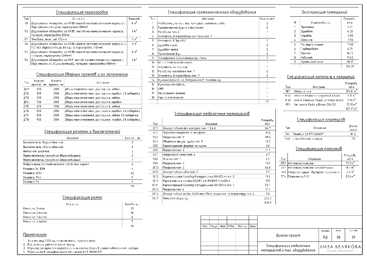 В спецификации указана вся информация о наполнении квартиры: чистовые отделочные материалы, мебель, сантехника и свет